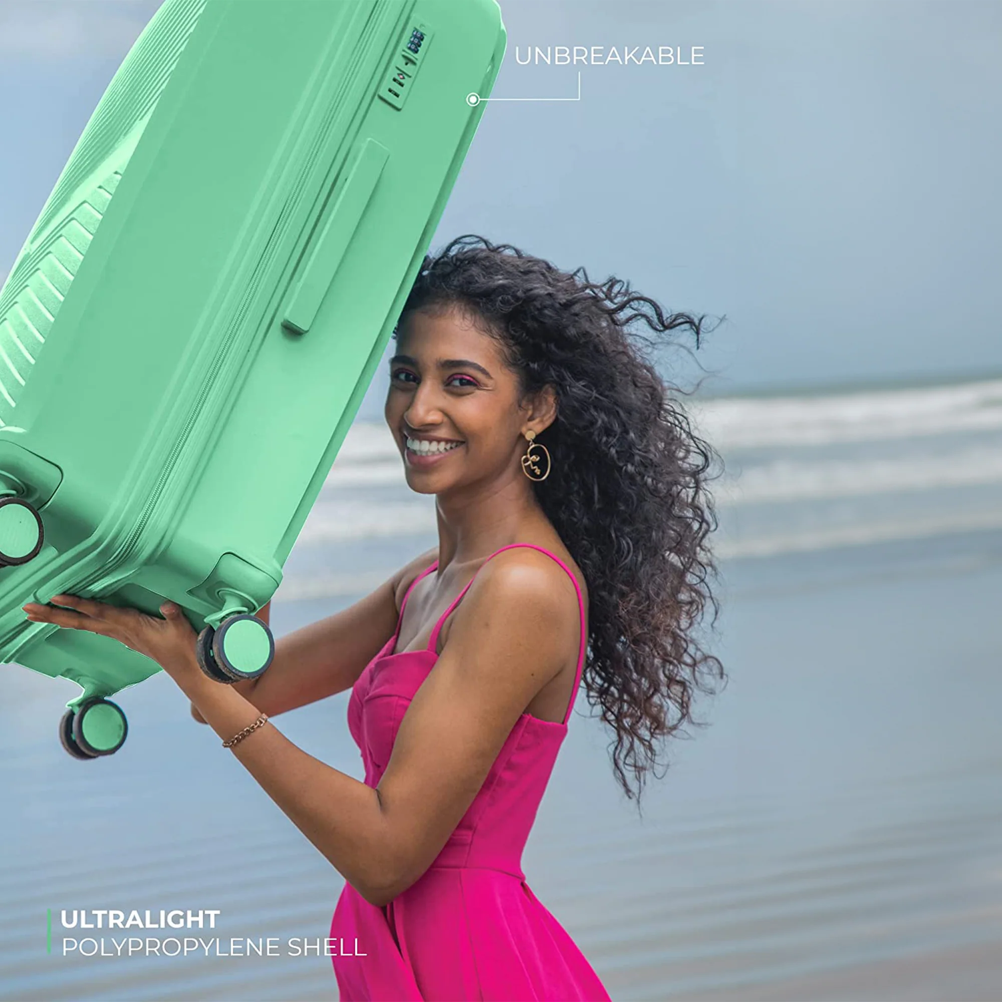 Outer Material: Luggage is made from 100% polypropylene which is very resilient, durable and lightweight. It is made to absorb impact by flexing while under stress then popping back to its original shape, eliminating dents and dings while protecting its contents.
