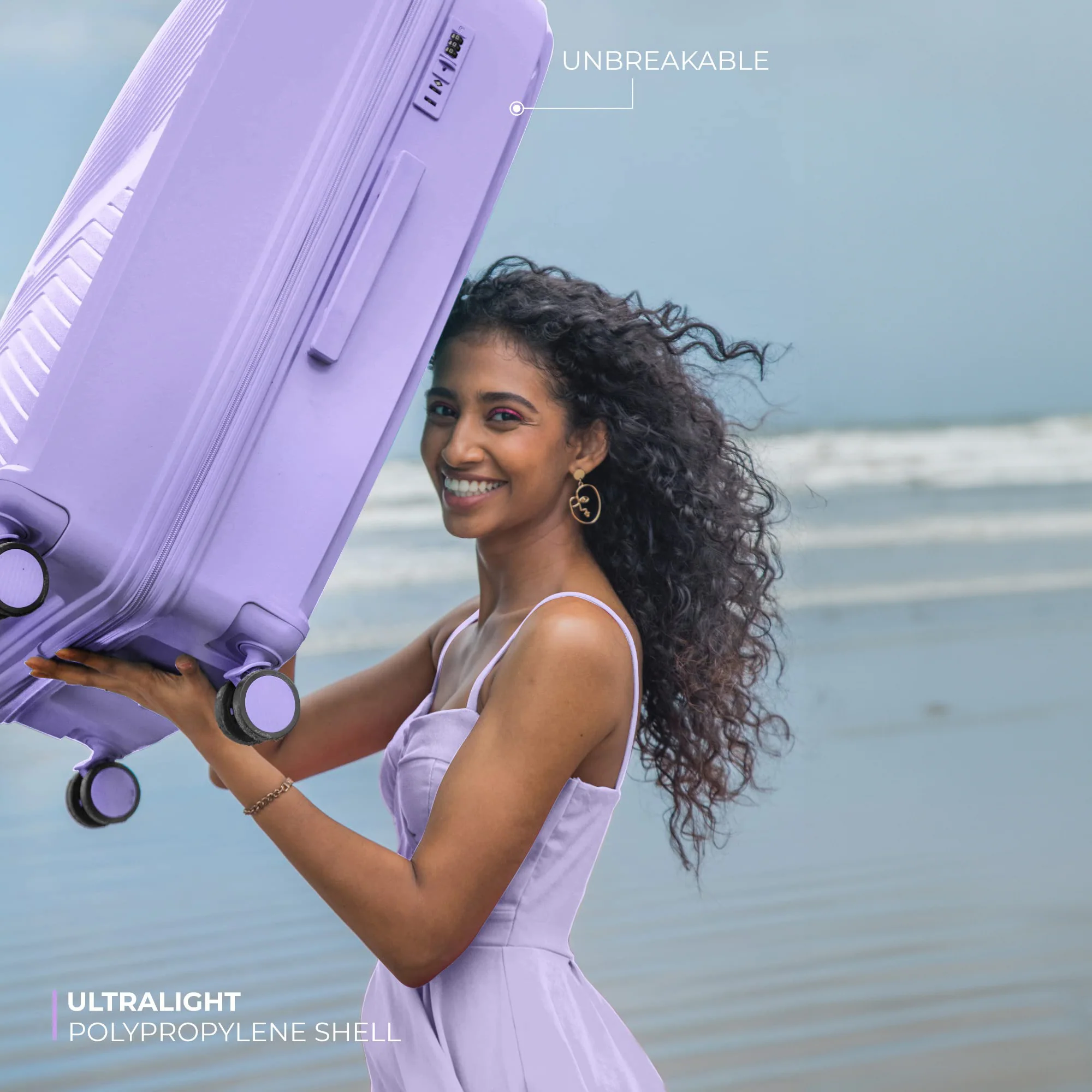 Outer Material: Luggage is made from 100% polypropylene which is very resilient, durable and lightweight. It is made to absorb impact by flexing while under stress then popping back to its original shape, eliminating dents and dings while protecting its contents.